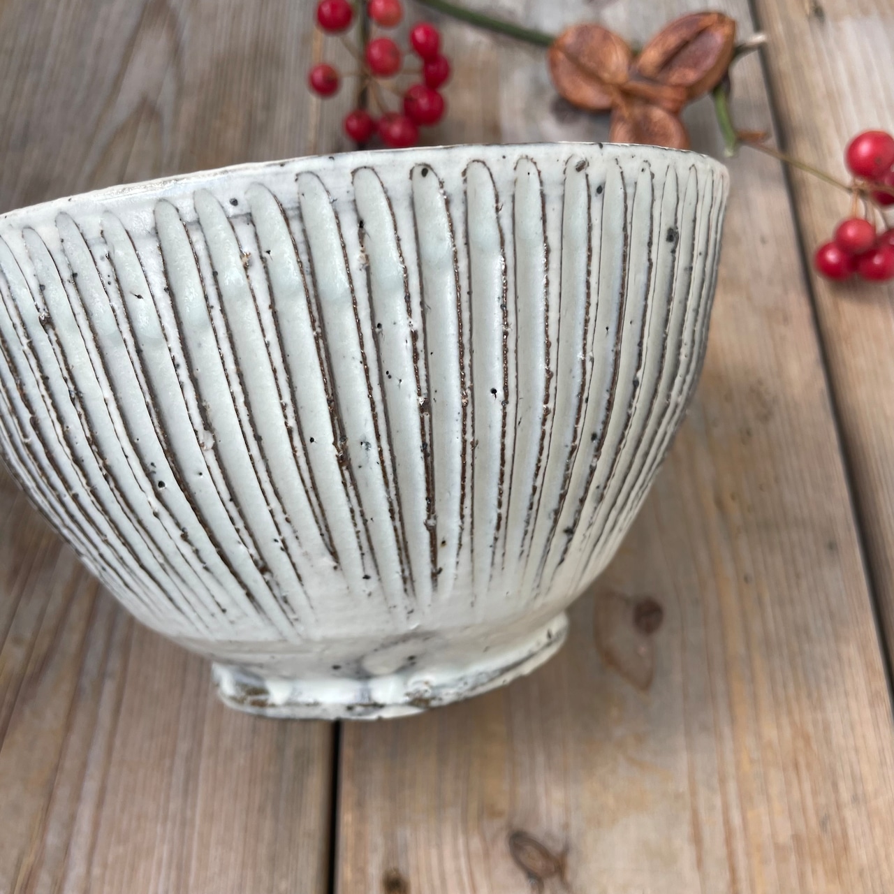 細めのしのぎの上から、粉引が流され、素朴で土の温もりを感じれるうつわです。