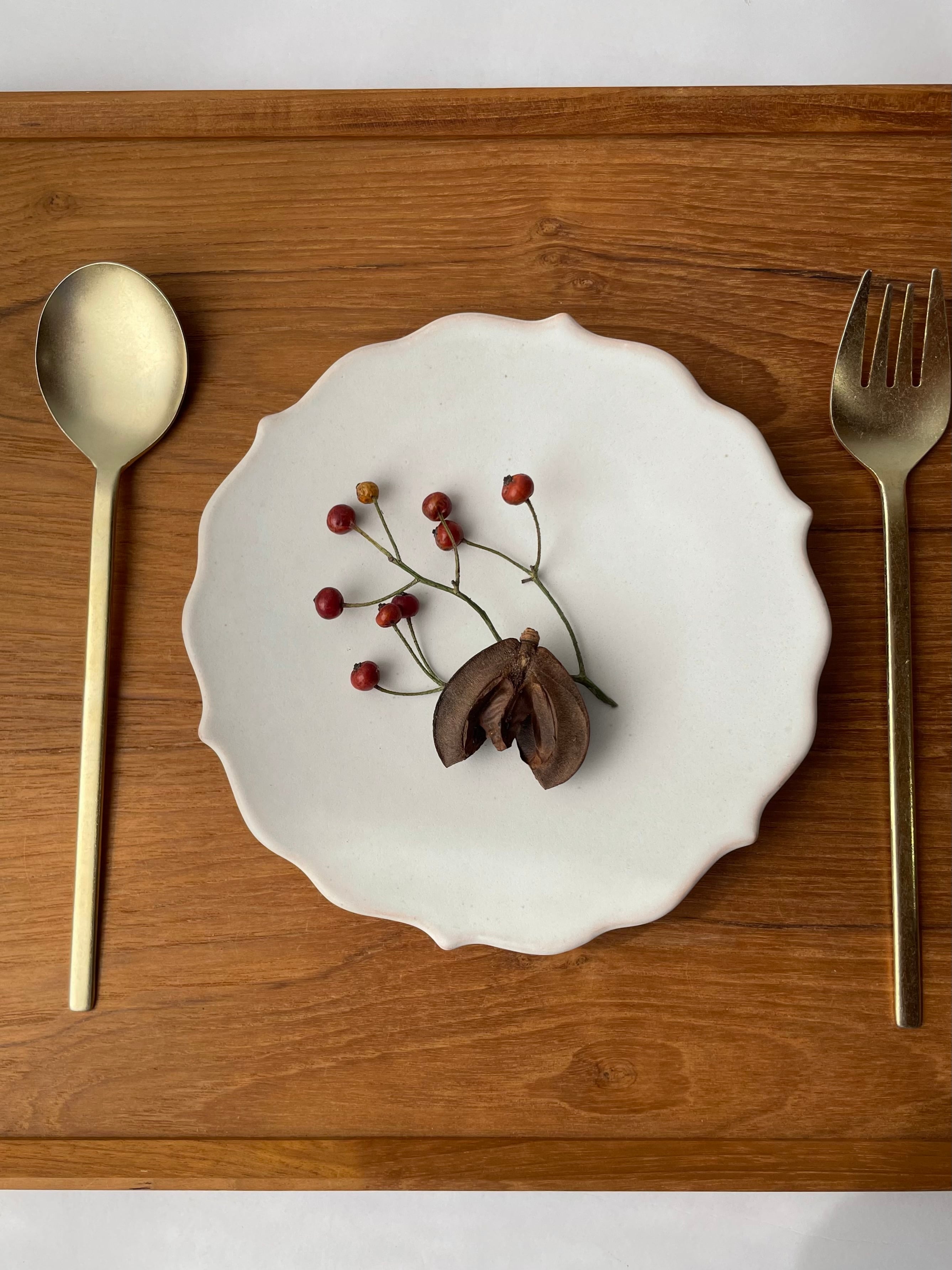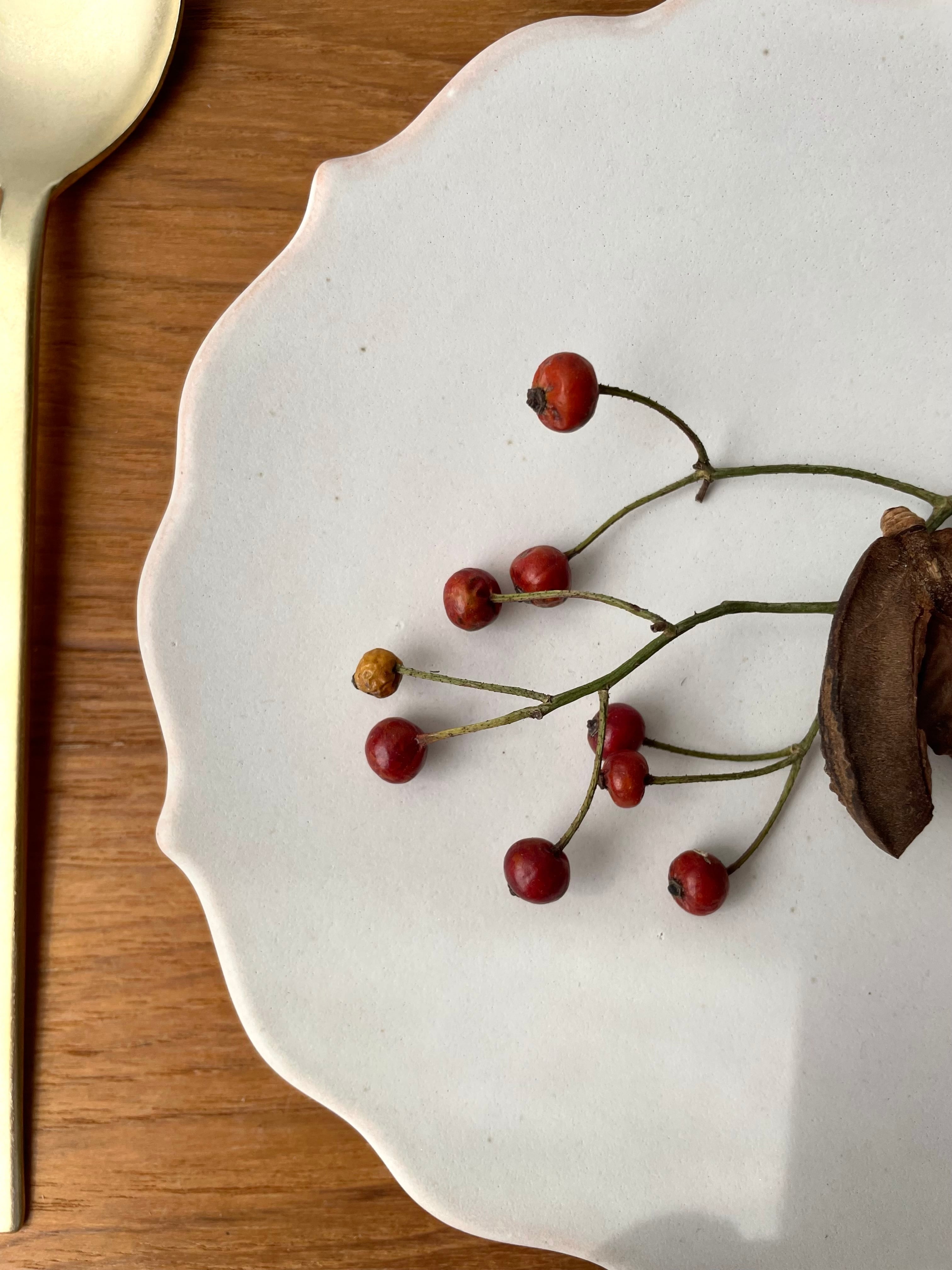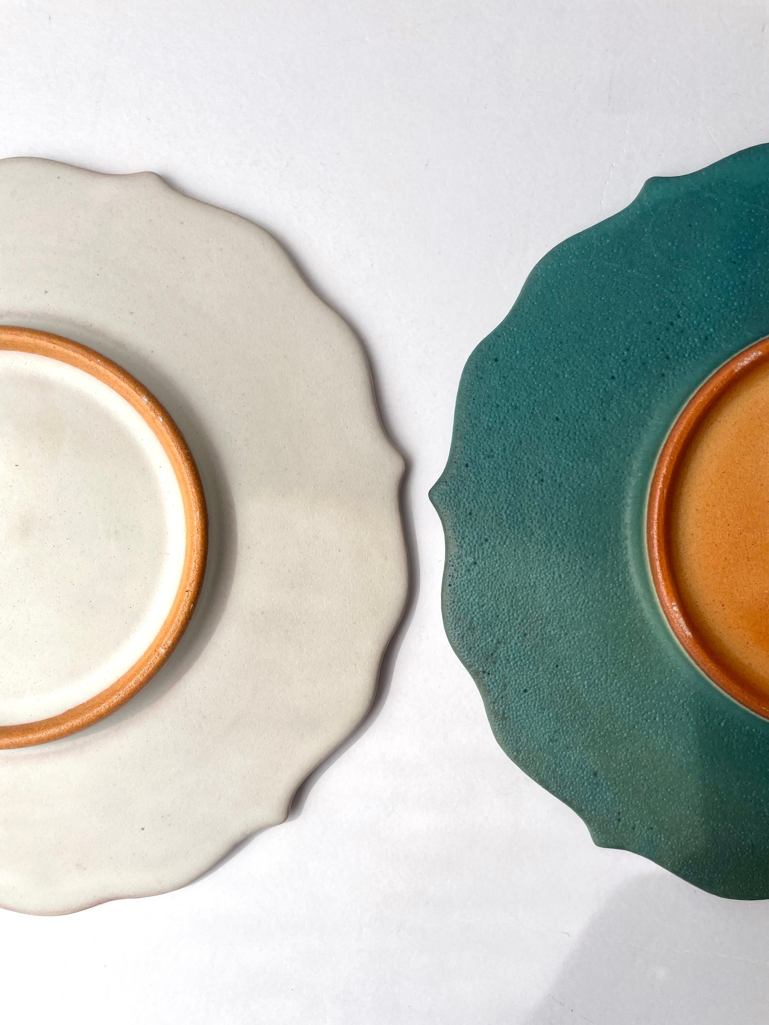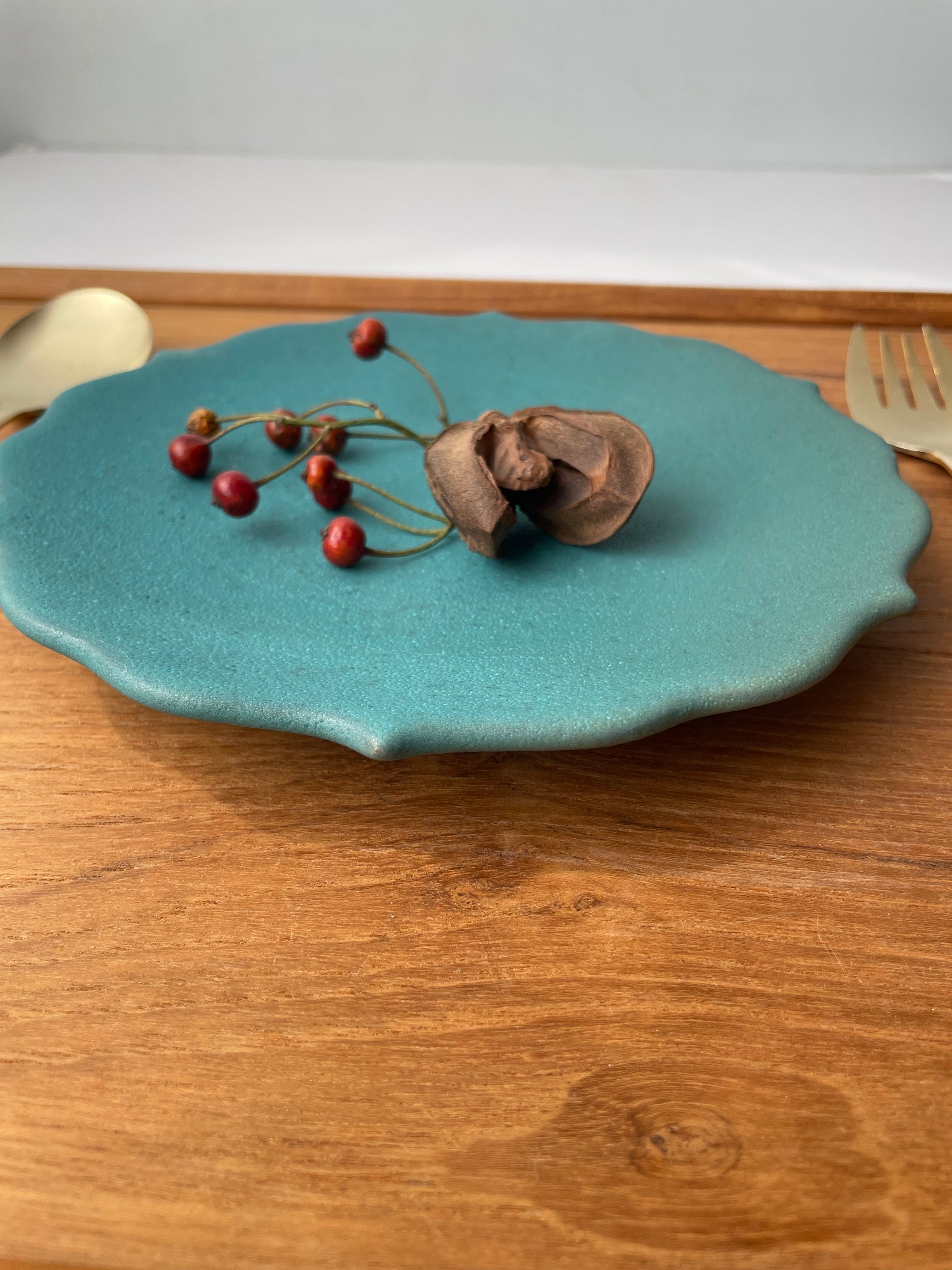 土の温かみを感じながらも、どこか無機質な洗練されたデザインと、マットな、ホワイトとターコイズの釉薬が、食卓をより上質な物に彩ります。