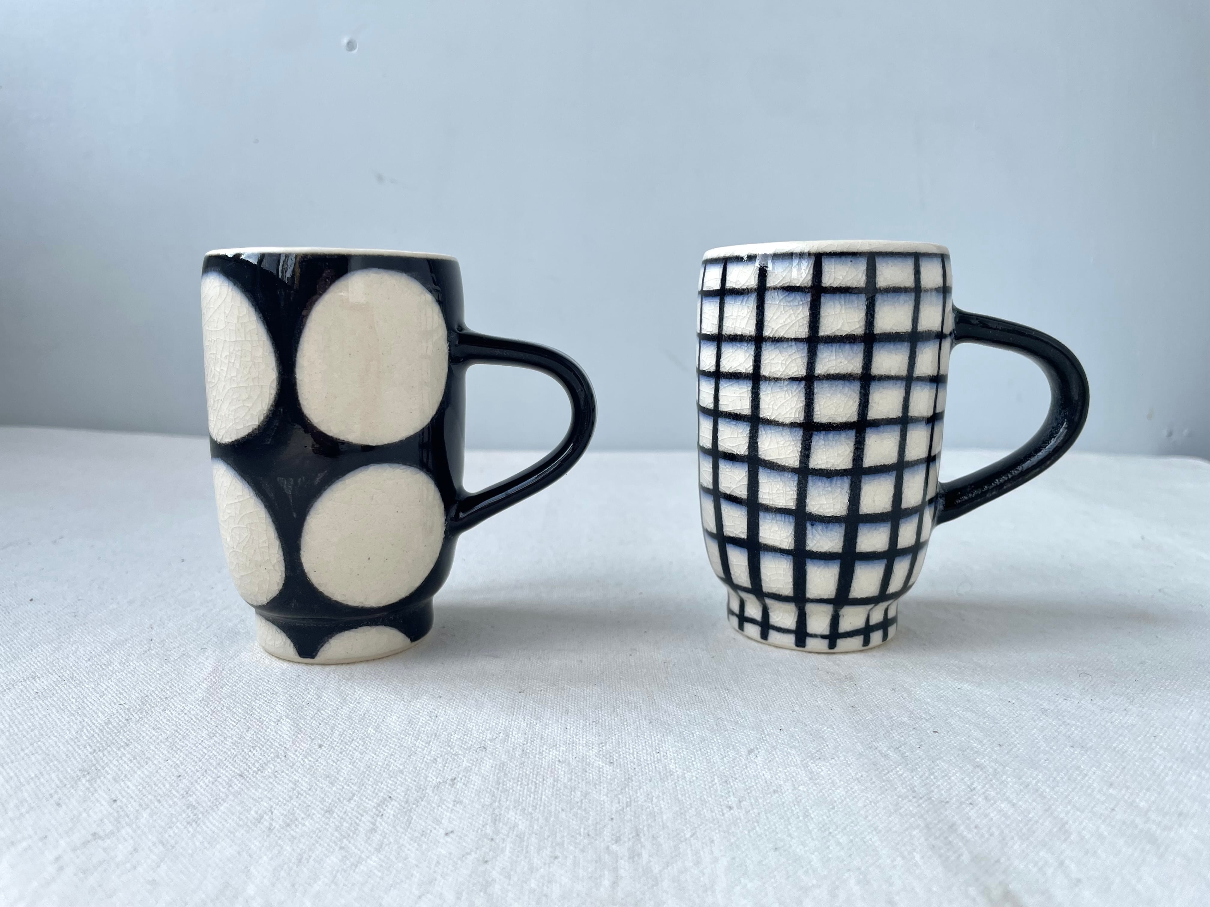 手描きの、少し不揃いなチェック柄とドット柄、貫入が可愛らしいマグカップです。